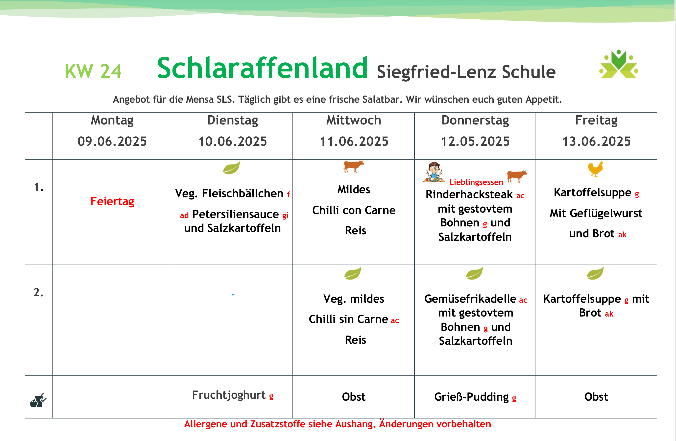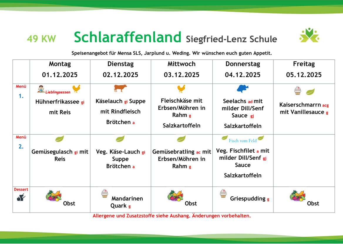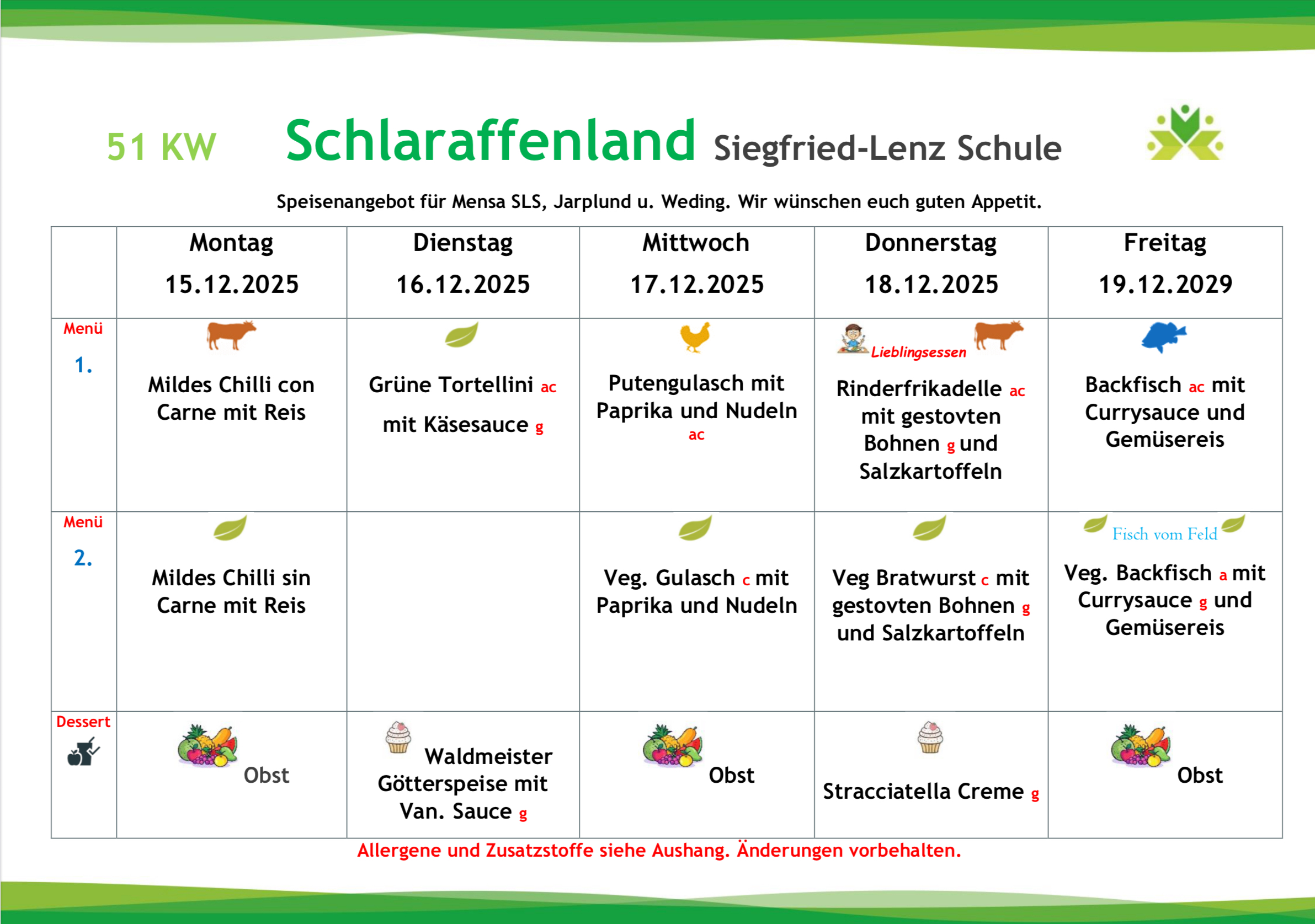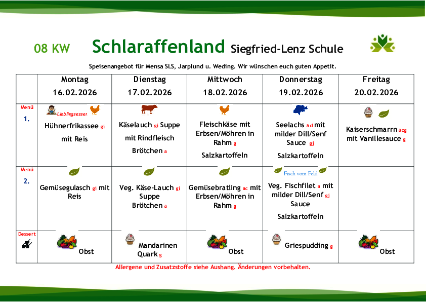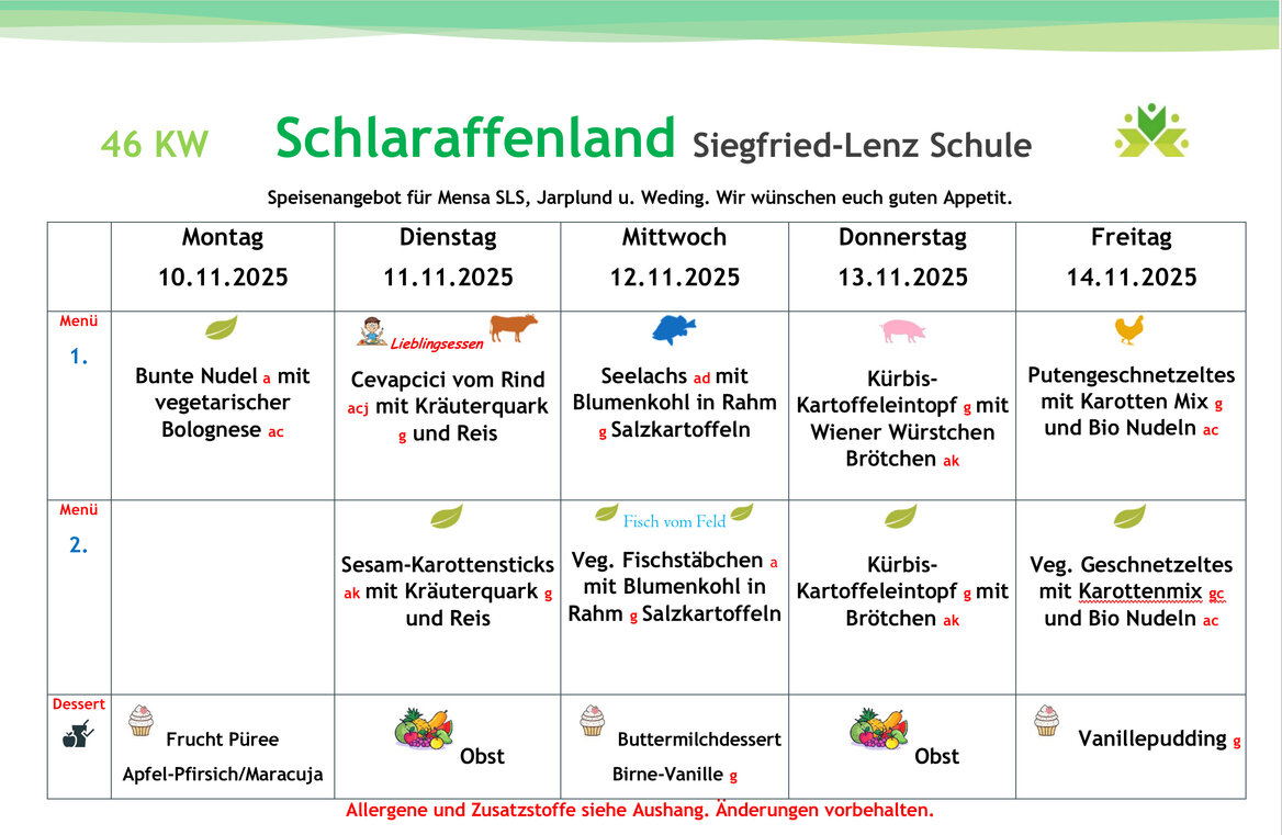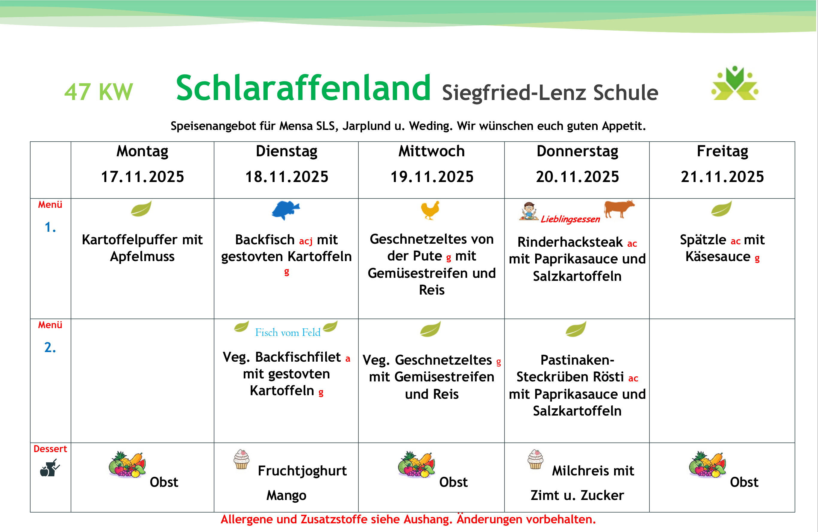 Die Gerichte werden zukünftig variabel auf die Wochentage verteilt, so dass beispielsweise der Fischtag nicht wie aktuell immer donnerstags, sondern auch an einem anderen Tag stattfinden wird. Jede zweite Woche wird an einem Tag ein sogenanntes „Lieblingsessen“ zubereitet (die Essenswünsche der Kinder und Jugendlichen werden berücksichtigt).