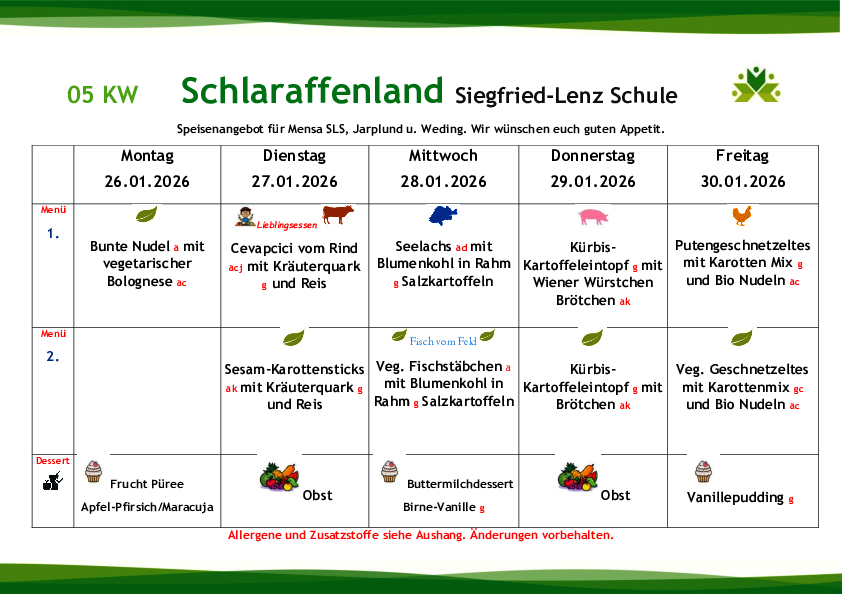Jedes vollwertige Mittagsangebot sollte neben der Hauptkomponente mindestens eine frische Komponente Obst, Rohkost sowie ein Getränk enthalten. In Anlehnung an die DGE-Richtlinien wurde ein abwechslungsreicher vollwertiger Wochenspeiseplan (5 Tage) für die Mensa Schlaraffenland erstellt.