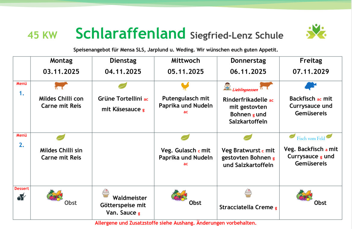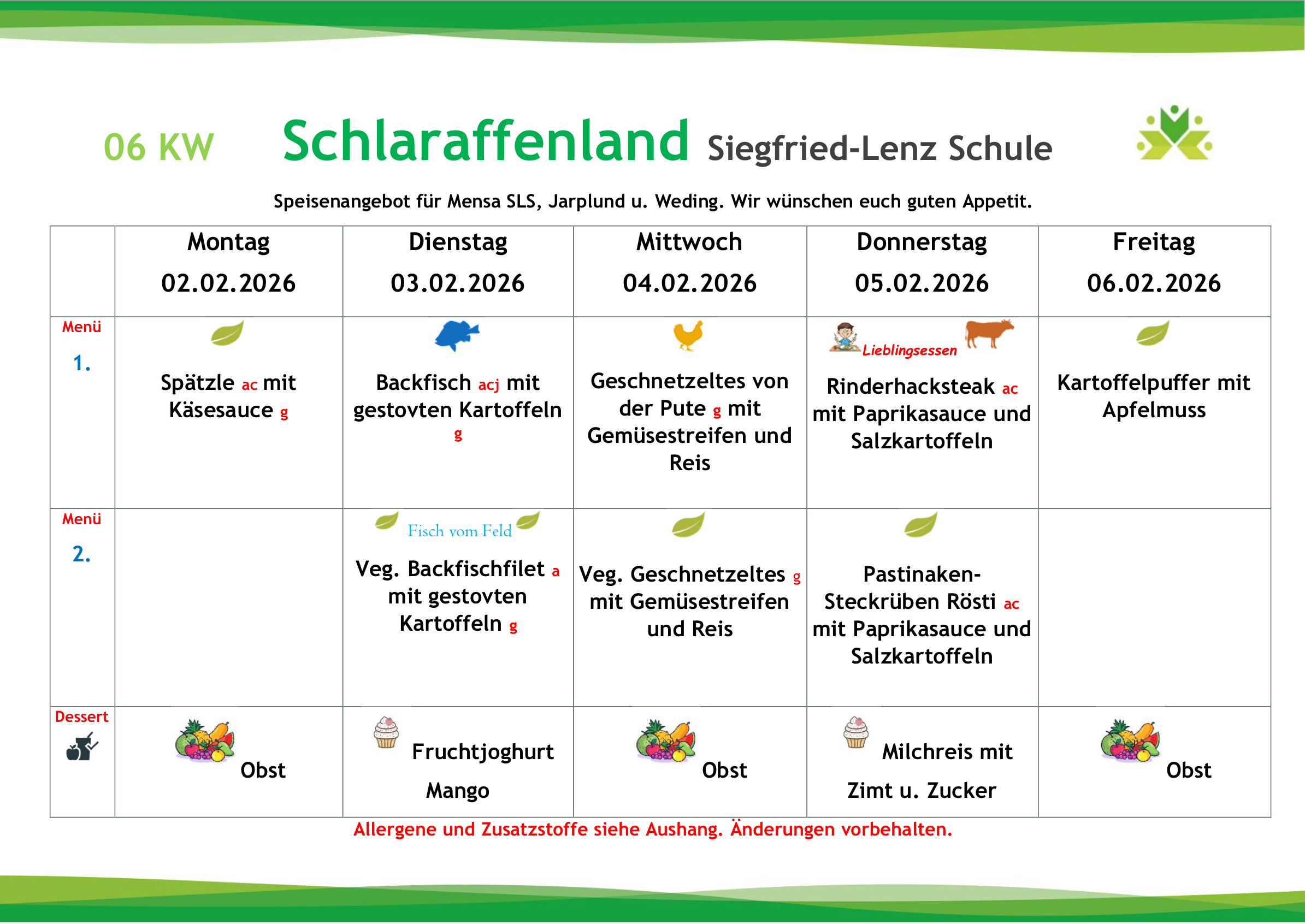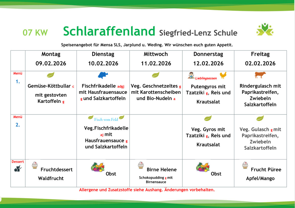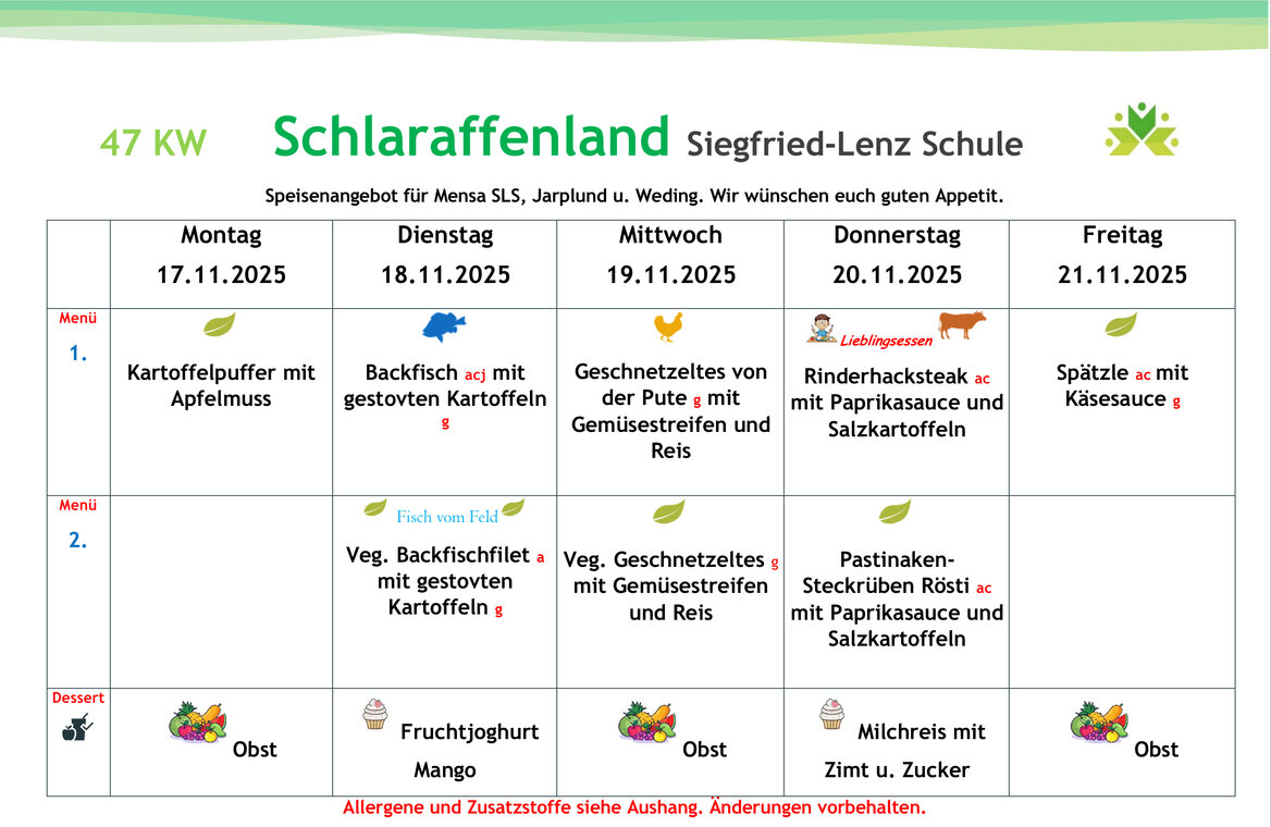 Die Gerichte werden zukünftig variabel auf die Wochentage verteilt, so dass beispielsweise der Fischtag nicht wie aktuell immer donnerstags, sondern auch an einem anderen Tag stattfinden wird. Jede zweite Woche wird an einem Tag ein sogenanntes „Lieblingsessen“ zubereitet (die Essenswünsche der Kinder und Jugendlichen werden berücksichtigt).